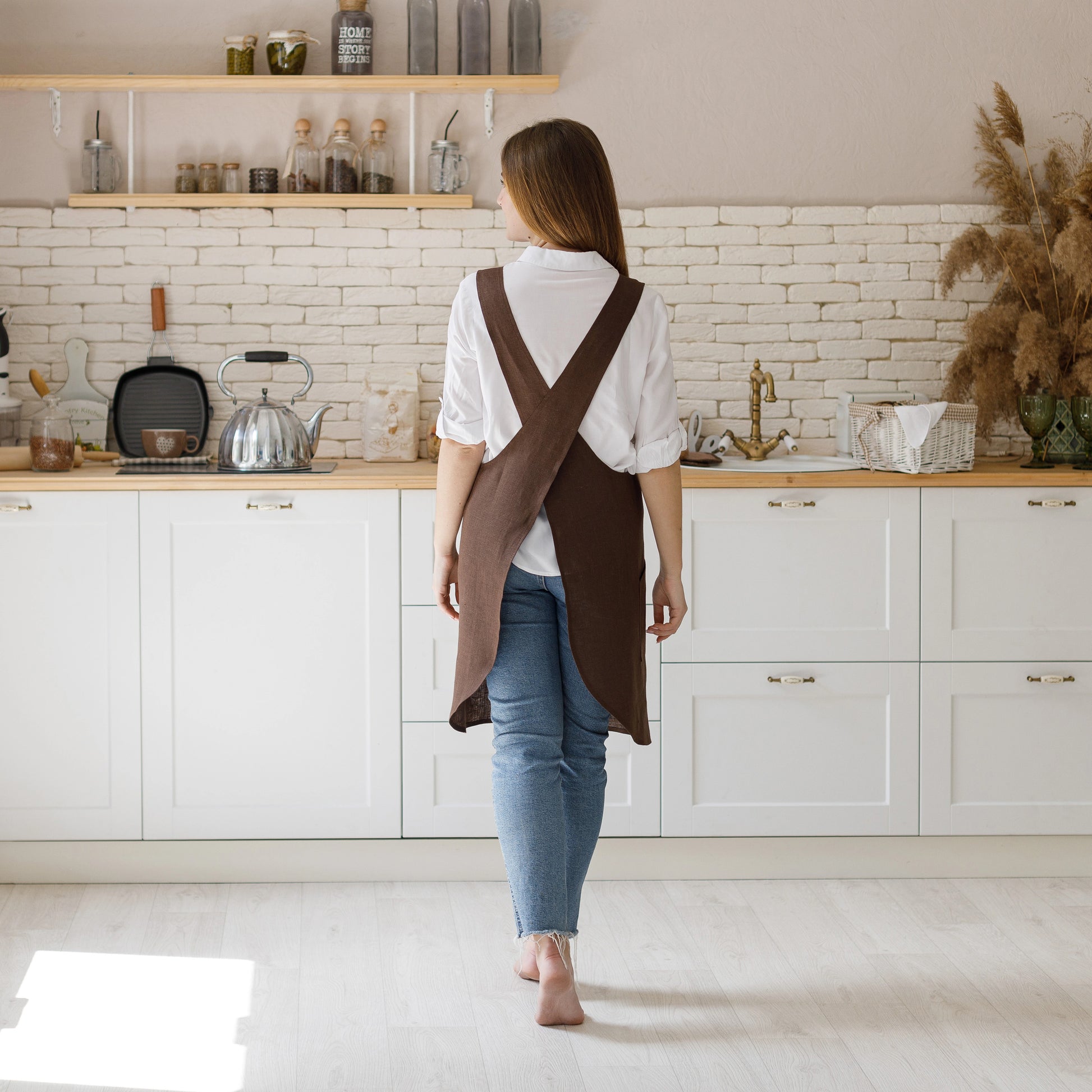 Comfortable and good looking work apron which is suitable for kitchen, cafe, garden, barista, chef, artwork, etc. It is made of natural linen, features two pockets, and has no ties as it just crosses over on your back. Japanese style aprons are easy to wear as they have nothing to tie.