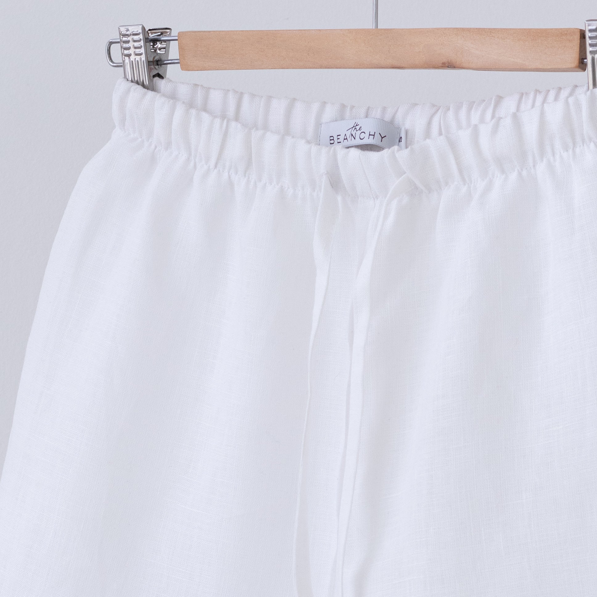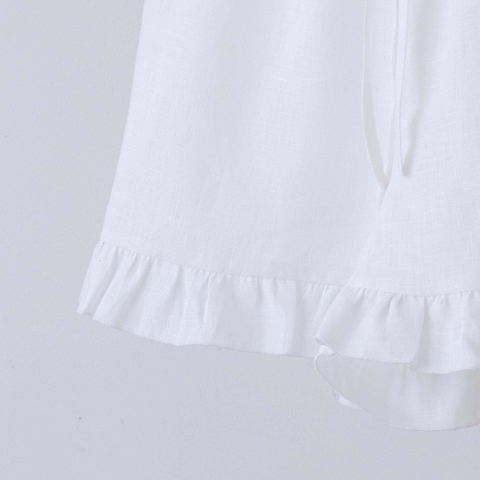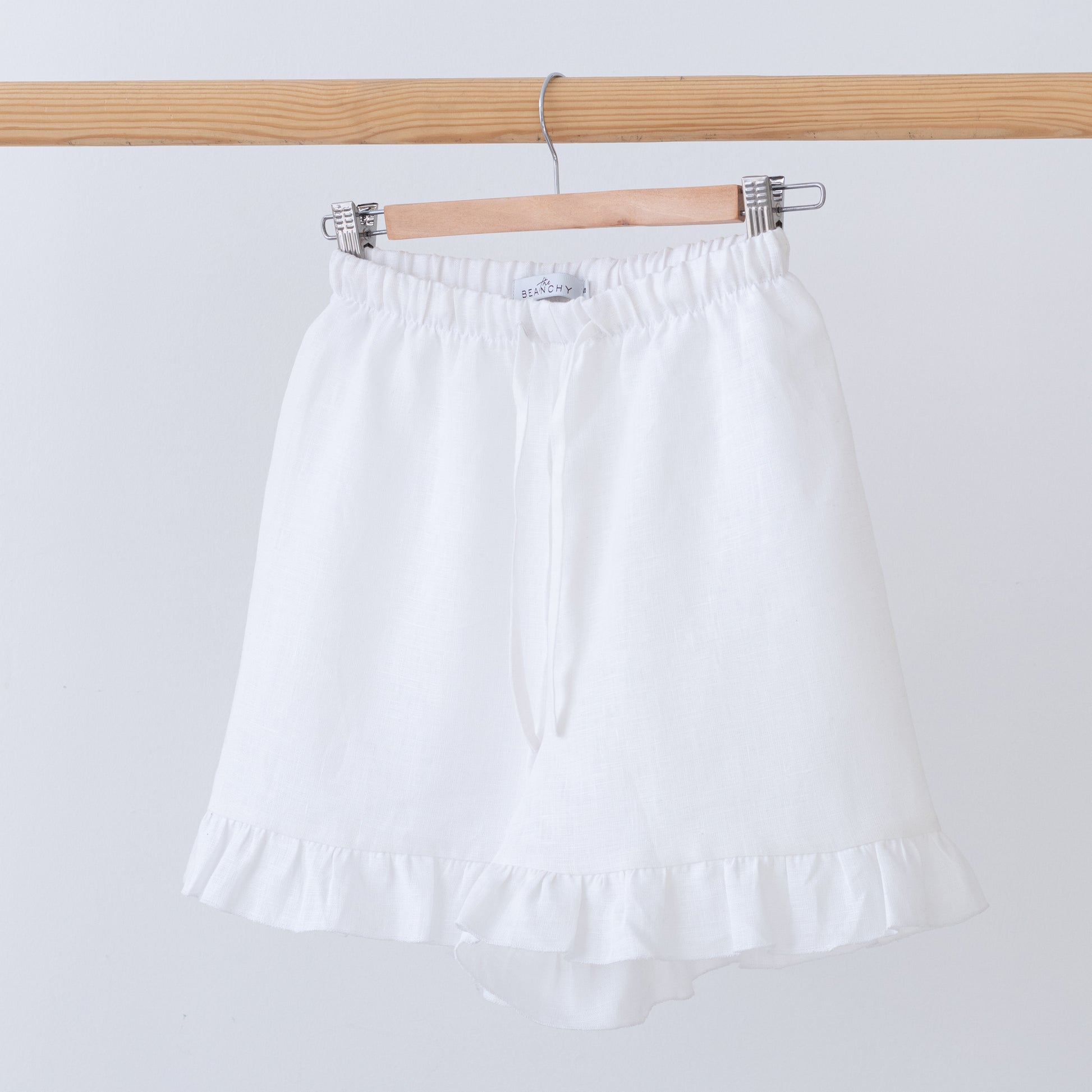 Elevate your style and feel like you're on vacation every day with our white linen shorts. The elasticized waist and ruffle insert add charm to any outfit while the breathable fabric provides ultimate comfort. Perfect for any occasion, these versatile shorts are a wardrobe must-have.