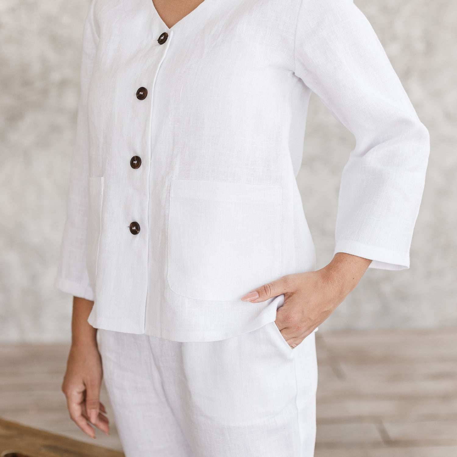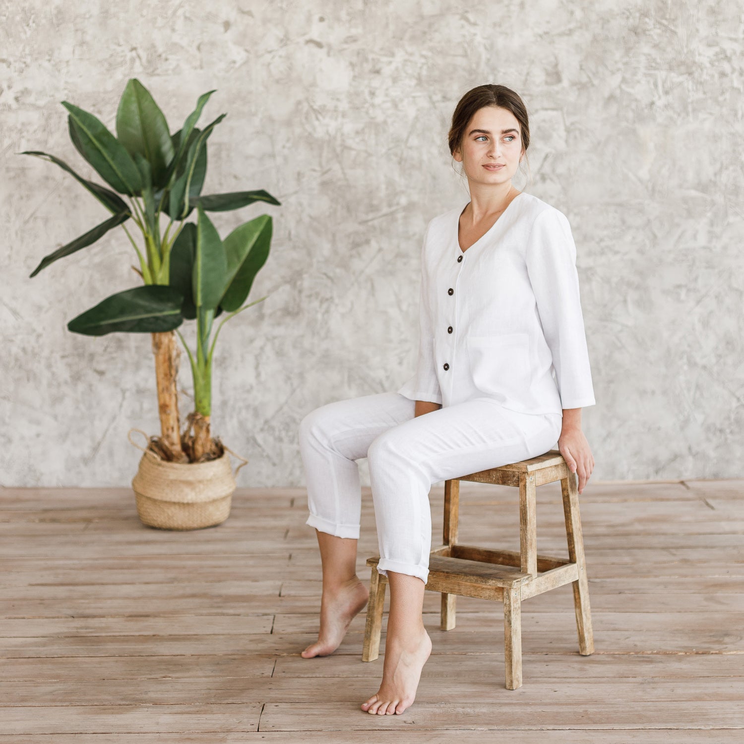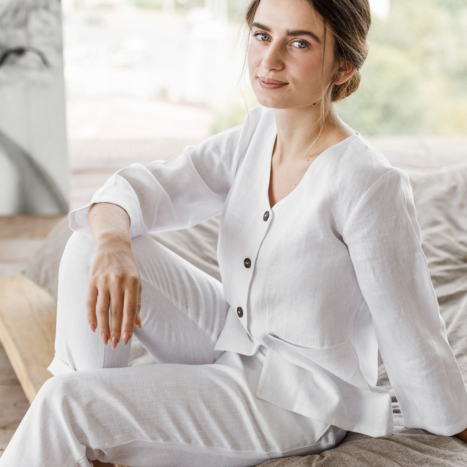 The best way to clean a linen garment is by pre-treating any stains with a stain remover while it's still wet. If there are no stains, you can just wash it in cold water with detergent or liquid soap. You should not use bleach or chlorine, as they will weaken the fibers of the fabric and cause them to yellow over time.